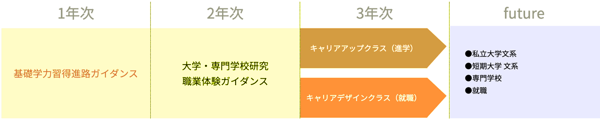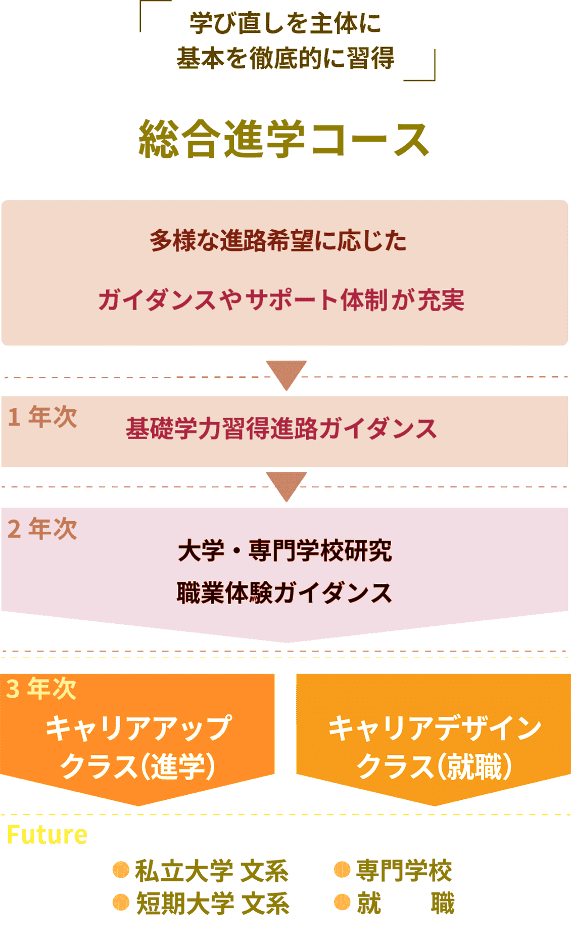 +部活動への積極的参加各教科とも、中学校の内容の学び直しと高校の内容の基礎・基本に重点を置いた授業を展開し、「わかる」「できる」楽しさを味わいながら学べるコースです。