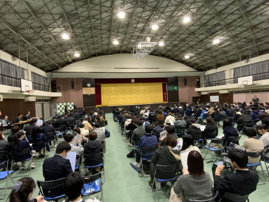 12/14(土)、今年度最後となる「第2回 入試説明会」を開催しました。12月も半ばとなり、期末考査も終わった頃でいよいよ本番、とても寒い日になりましたが沢山の中学生と保護者の皆様に来校していただきました。ありがとうございました。説明会は、9年連続全国大会出場中の空手部の演舞で幕を開け、卒業生の山田さん(近畿大学農学部食品栄養学科)から、在校中の思いと現在通学している大学について語ってもらいました。その後、PPにて募集要項に沿って、「コース紹介・Web出願・面接などについて」ご説明し、国語・数学・英語科の主任による入試問題のポイント解説・「キャリア教育推進部」より卒業後の進路等の説明も行いました。また、ダンス同好会や書道部のパフォーマンスも行いました。
