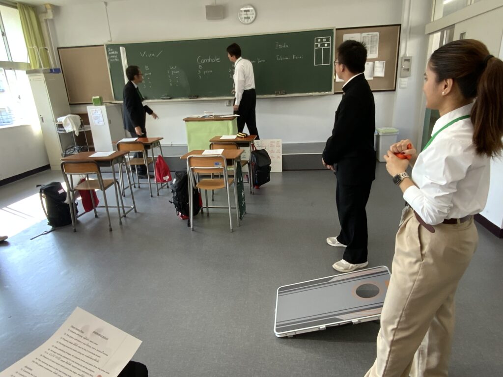 本日11/4(土)、今年度最後となる「第4回オープンハイスクール」を開催しました。暖かい秋晴れの中、沢山の中学生と保護者の皆様に来校していただきました。今回生徒会とともに、空手道部の女子部員が誘導を、女子バスケットボール部の部員が資料の配布を担ってくれて、生徒も参加した会が開けました。内容は、学校紹介(PPにて説明)・模擬授業(国語「百人一首に親しもう!」・数学「iPadを使って高校数学を体験しよう!」・英語「Let’s play “corn hole”〜アメリカの遊びを体験しよう〜」・理科「盲斑の実験」・日本史「映像で理解する〜信長の天下統一〜」)、施設見学・部活動体験(空手道部・ゴルフ部・サッカー部・射撃部・卓球部・軟式野球部・ハンドボール部・陸上競技部)・個別懇談に参加していただきました。