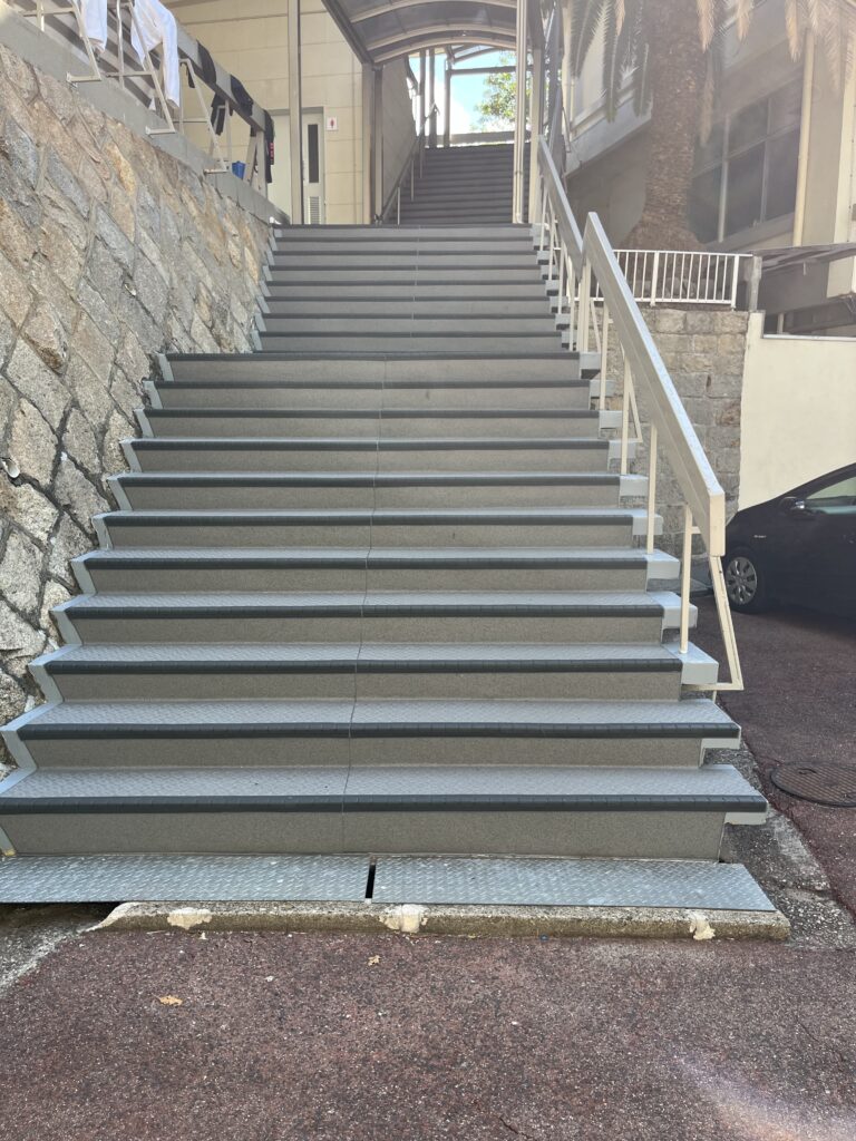 生徒の夏休みの期間を利用して、校内外階段の補修工事を行いました。
