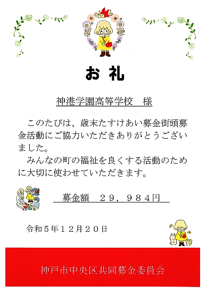 2023.12.20クラブ 「令和5年度 歳末たすけあい募金」の実施 12月20日二学期終業式のあと、ボランティア同好会がJR元町駅前で「令和5年度 歳末たすけあい募金」を行いました。多くの方々から募金をしていただきました。ありがとうございました。 ≪ 前の記事 記事一覧 次の記事 ≫