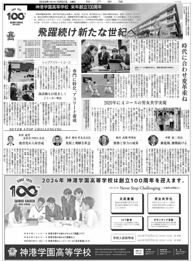 2023.10.31学校行事 創立100周年広告(10月31日神戸新聞朝刊掲載) 2024年5月に本校創立100周年を迎えるにあたり、10月31日(火)の神戸新聞朝刊に広告を掲載しました。 ≪ 前の記事 記事一覧 次の記事 ≫