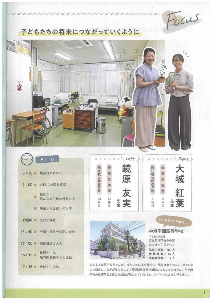 2025.10.27お知らせ 保健雑誌「健」に掲載されました。 日本学校保健研修社様に本校の保健室を取材いただき、保健雑誌「健」11月号に掲載されることとなりました。今年度から2人体制となった保健室の日常や取り組みを、4ページにわたり記事にしていただきました。 Screenshot ≪ 前の記事 記事一覧 次の記事 ≫