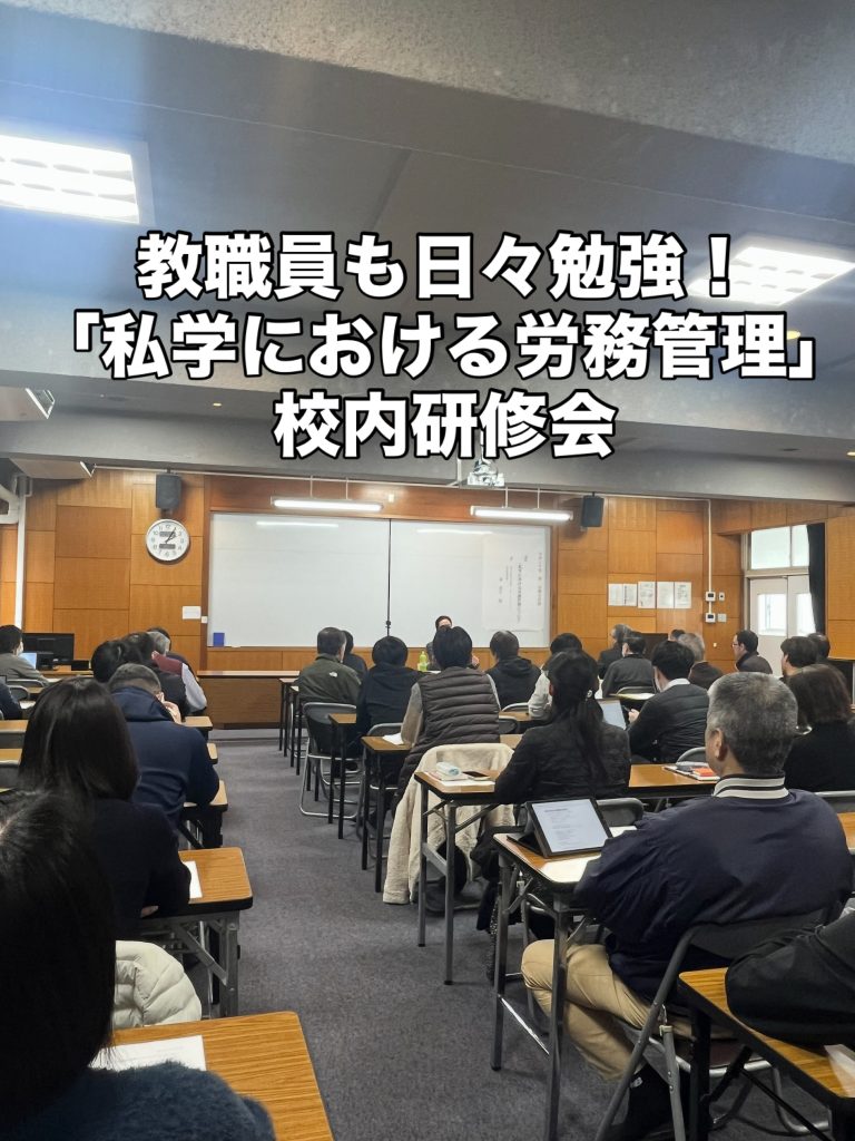 2025.12.02お知らせ 職員研修会「私学における労働管理」実施 12月1日(月)に社会保険労務士の東 岳生先生をお招きして、「私学における労働管理」というテーマで教職員向けの研修会を実施しました。教職員もよりよい学校を目指すため、日々勉強を重ねております。 ≪ 前の記事 記事一覧 次の記事 ≫